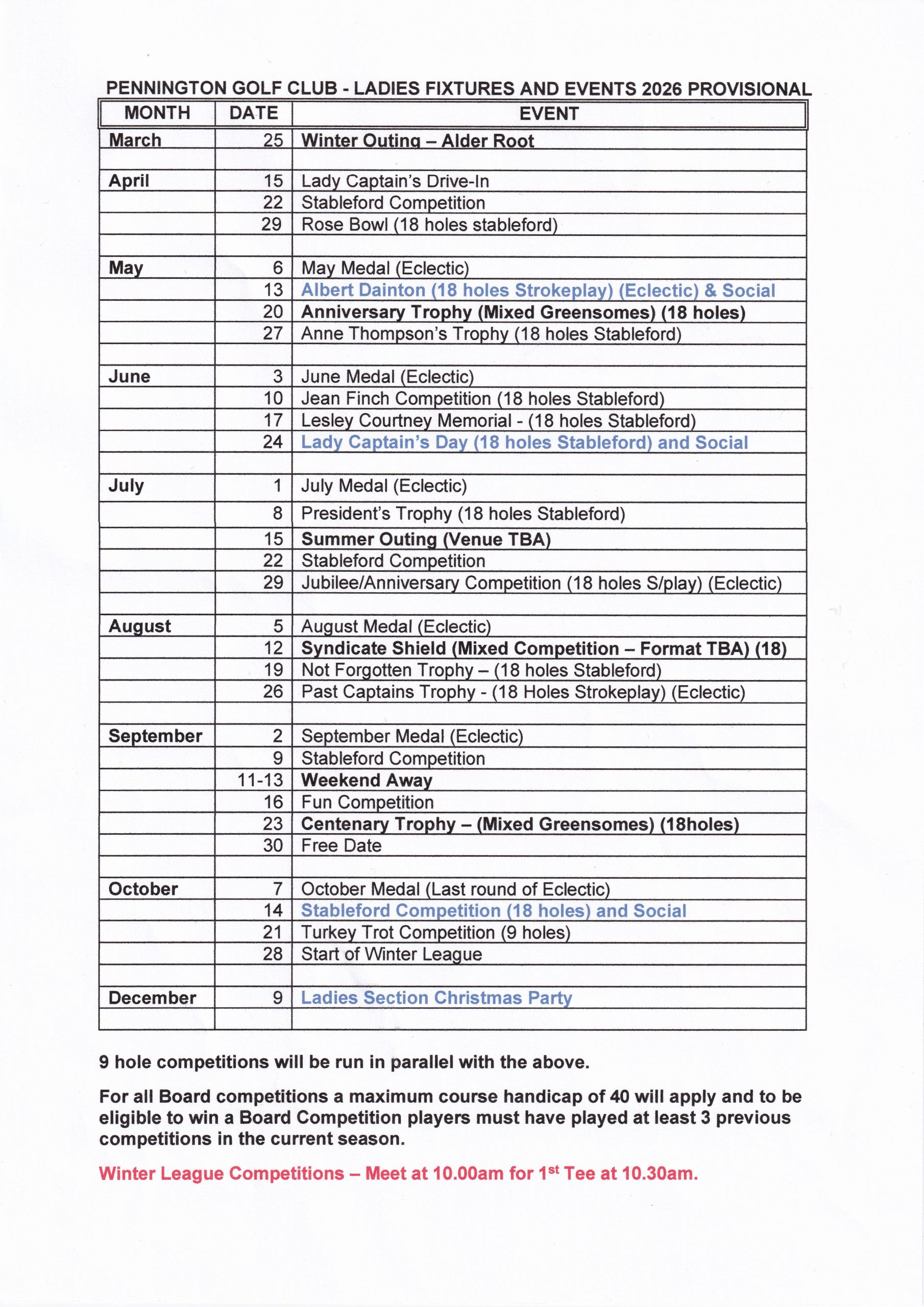 THE WOMENS’ COMPETITIONS SCHEDULE IS SHOWN BELOW